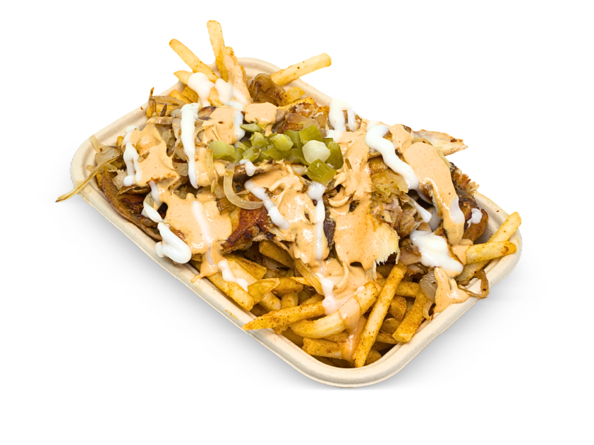 100% halal chicken marinated 48 hours in Mediterranean spices, wrapped in lavash with garlic sauce, pickles, salad & greens.